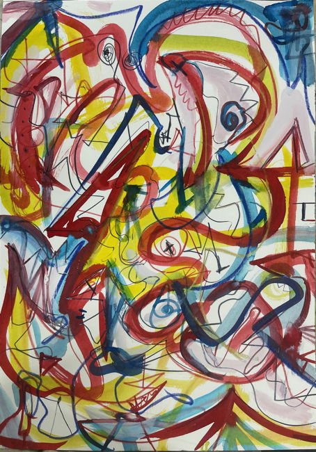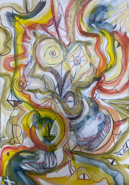 Puis captant l'intensité de l'instant présent, sous mon pinceau, naissent des traits qui s'enchevêtrent tels des fils imaginaires.